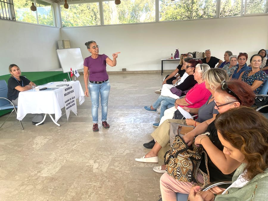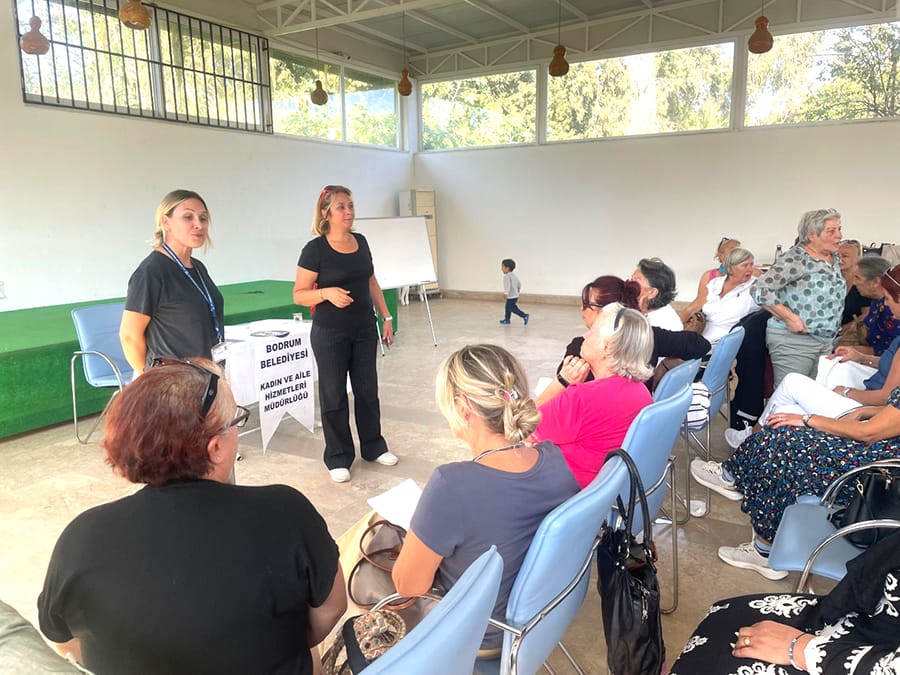 Kemer Mevkii’nde yer alan Bodrum Belediyesi Akyarlar Çok Amaçlı Salon’da düzenlenen buluşmaya Akyarlar Muhtarı İsmihan Ulutaş, Bodrum Belediyesi Kadın ve Aile Hizmetleri Müdür Vekili Av. Gözde Çakıroğlu, Bodrum Kadın Dayanışma Derneği Başkanı Figan Erozan, dernek üyeleri ve müdürlük personelleri ile mahallede yaşayan kırka yakın kadın katıldı.