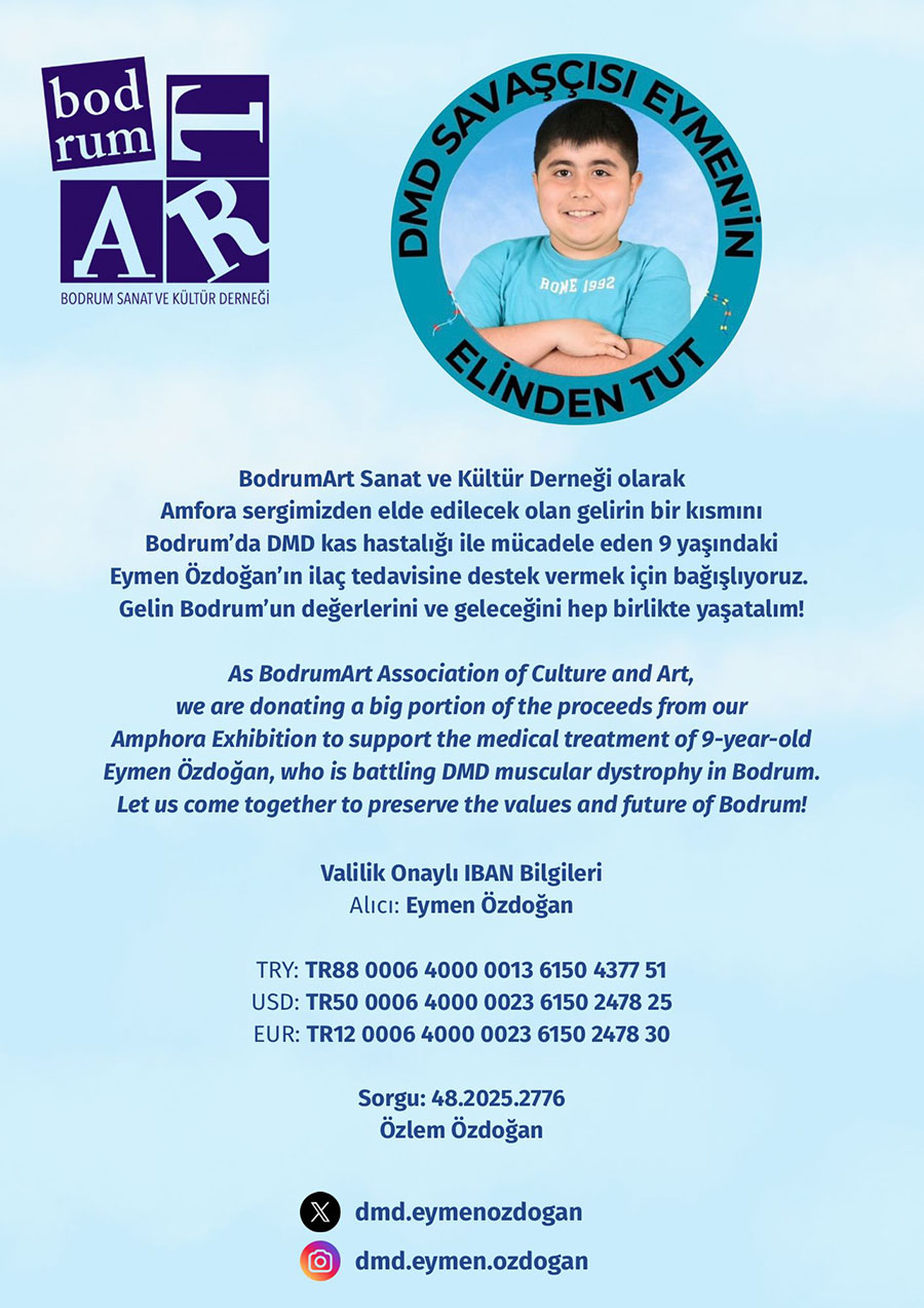 40 sanatçının eserinin yer aldığı Amfora sergisinden elde edilecek gelirin bir kısmı Bodrum’da DMD kas hastalığıyla mücadele eden 9 yaşındaki Eymen Özdoğan’ın ilaç tedavisi için bağışlanacaktır.