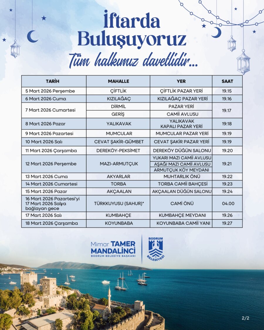 “Ramazan’ın ruhu olan paylaşmayı, mahallelerimizin samimiyetiyle birleştiriyoruz. Birliğimizi güçlendirmek, kardeşlik bağlarımızı tazelemek ve dayanışmanın gücünü hep birlikte yaşamak adına; 19 Şubat Perşembe akşamı Türkbükü Mahallemizde kuracağımız ilk iftar soframıza tüm mahalle sakinlerimizi bekliyoruz. Hayırlı Ramazanlar.”