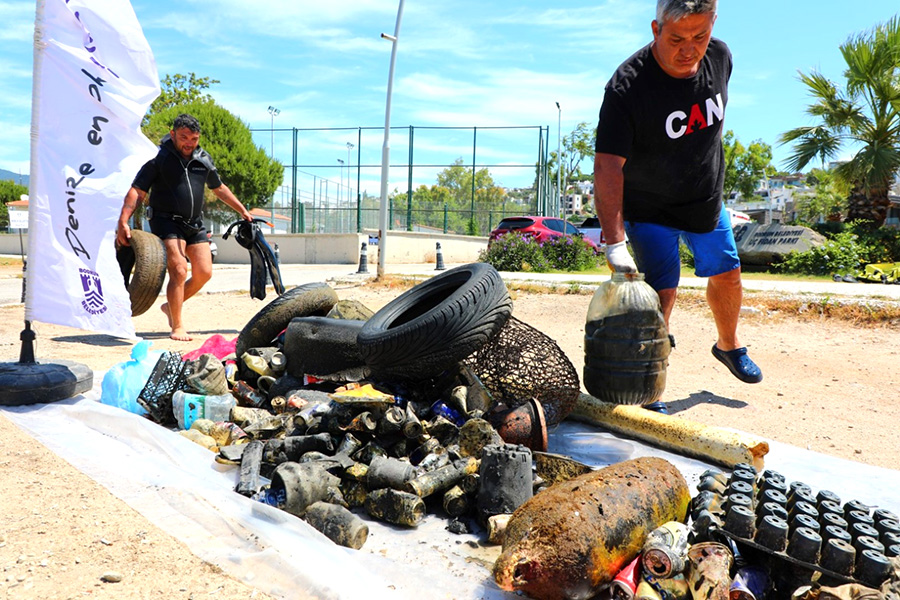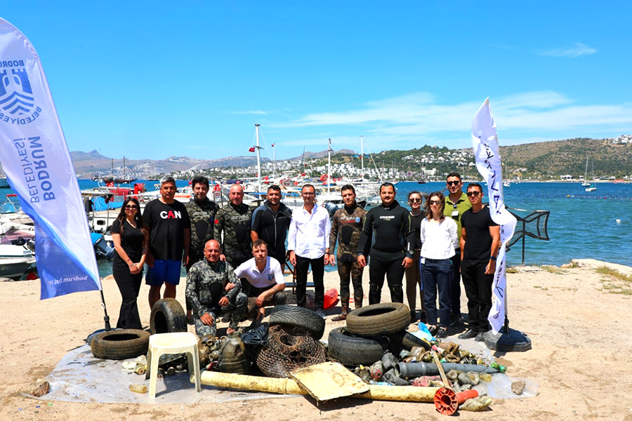Bodrum’un mavisini korumak amacıyla yapılan temizlik etkinliğinde denizden cam ve plastik şişeler, içecek kutuları, plastik kasa ve araba lastiği gibi çok sayıda atık çıkarıldı.