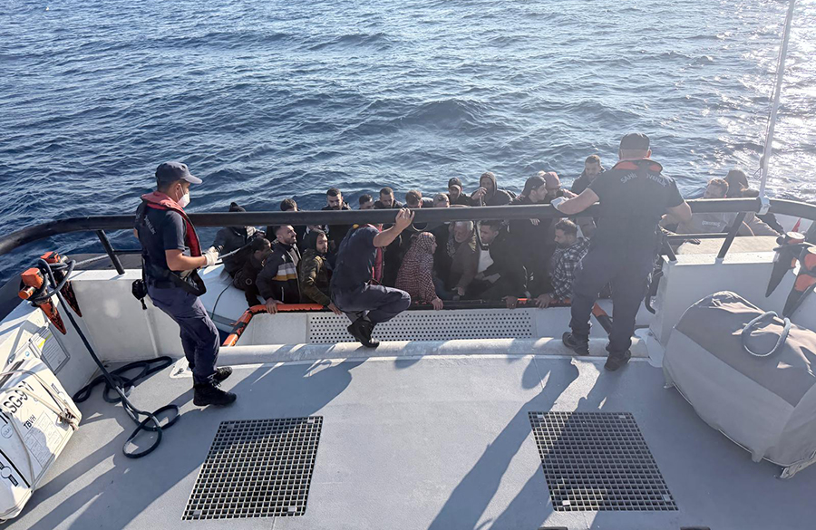 TCSG-901 botu tarafından hareketli fiber karinalı lastik bot durdurulmuş, içerisinde 5’i çocuk 30 düzensiz göçmen ve 1 göçmen kaçakçısı şüphelisi yakalandı.