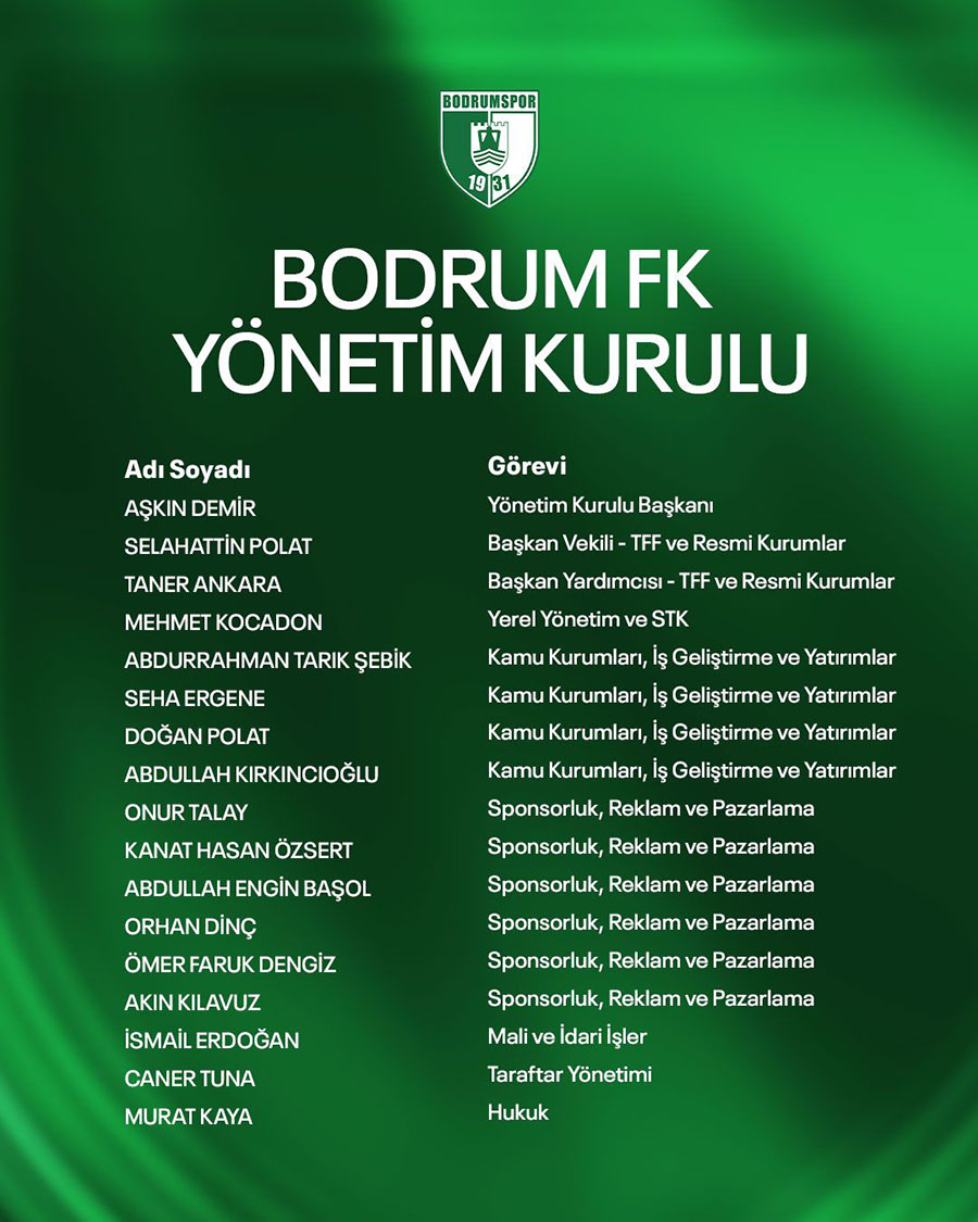 Trendyol 1. Lig ekiplerinden Sipay Bodrum FK, 2025-2026 sezonu öncesi yönetim kadrosunu baştan sona yeniledi. Kulüp Başkanı Aşkın Demir liderliğinde oluşturulan 34 kişilik yeni yönetim kurulu, görev dağılımlarıyla birlikte kamuoyuna açıklandı.