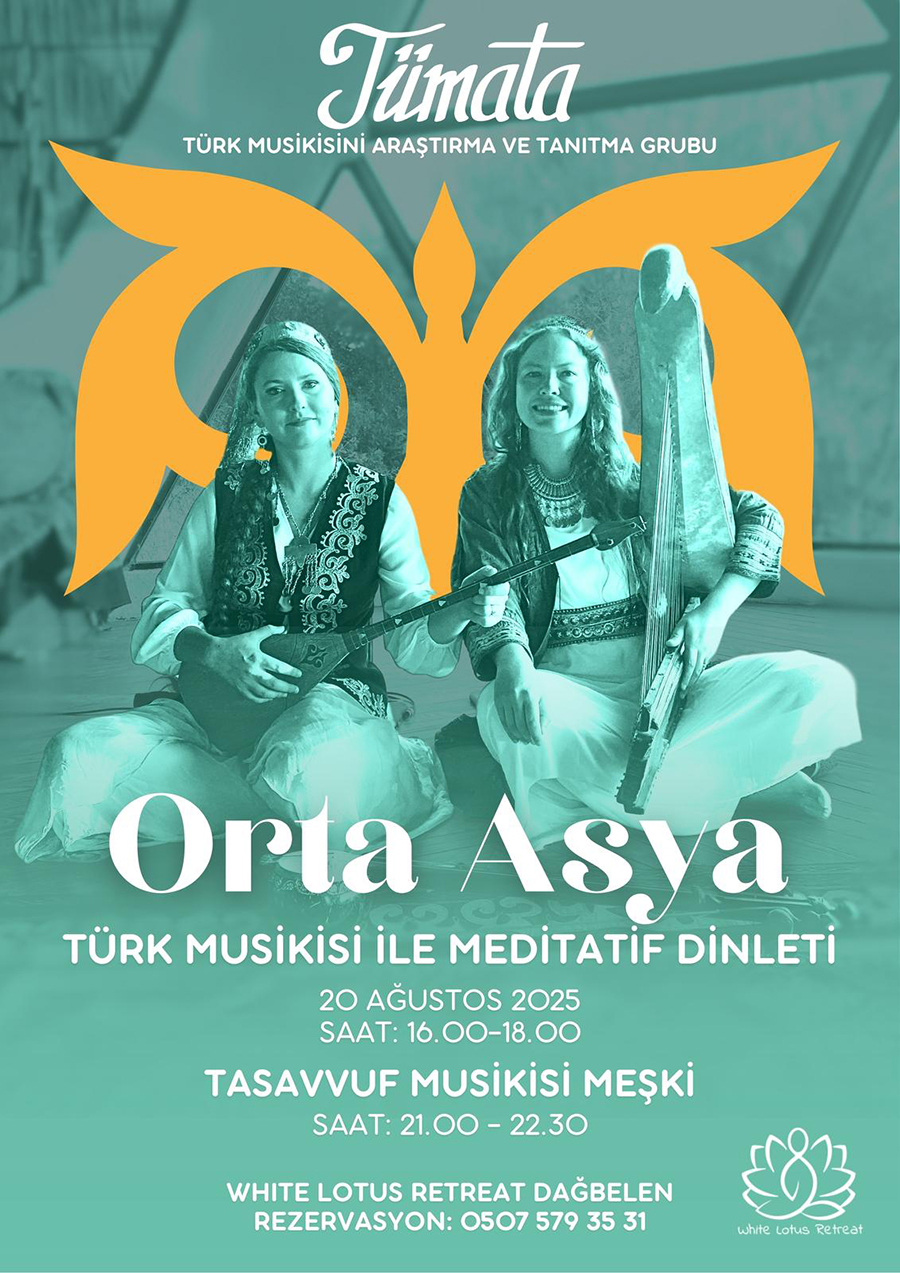 Türk Musikisini Araştırma ve Tanıtma Grubu (TÜMATA) 20 Ağustos 2025’te Bodrum White Lotus Merkezi’nde, kadim Türk tıbbında şifahanelerde uygulanan müzik terapi geleneği ve tasavvuf musikisi geleneğini buluşturan özel bir etkinlik düzenliyor.