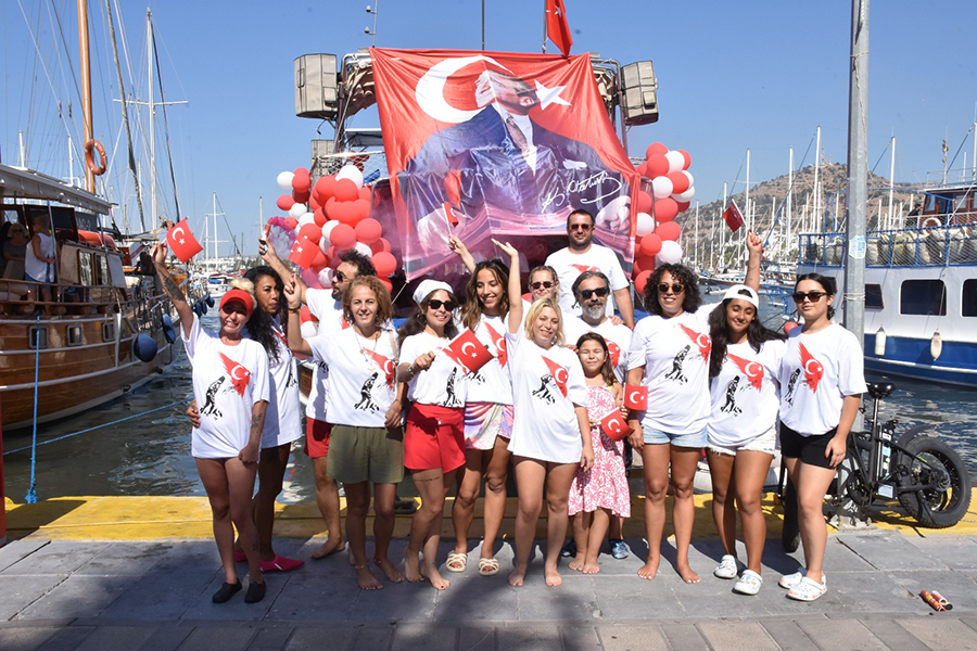 Bodrum’da kırmızı beyaz balonlarla süslenerek dev Atatürk posteri asılan tekneyle günlük tura çıkanlar, 30 Ağustos Zafer Bayramı coşkusunu denizde yaşadı.