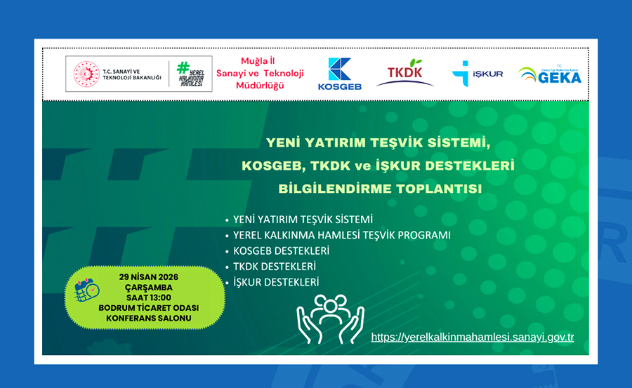 Bodrum Ticaret Odası ev sahipliğinde 29 Nisan 2026 Çarşamba günü saat 13:00’te; Muğla İl Sanayi ve Teknoloji Müdürlüğü, KOSGEB Muğla İl Müdürlüğü, Tarım, İŞKUR Muğla İl Müdürülüğü ve Kırsal Kalkınmayı Destekleme Kurumu (TKDK) Muğla İl İrtibat Ofisi ve Güney Ege Kalkınma Ajansı iş birliğinde “Yeni Yatırım Teşvik Sistemi, Yerel Kalkınma Hamlesi, KOSGEB, TKDK ve İŞKUR Destekleri Bilgilendirme Toplantısı” düzenlenecek.