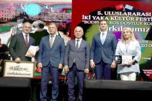 Dostluk Konserinde hediye ve plaket takdimleri yapılırken Kos’ta bir parçası Bodrum Belediye Başkanı Mandalinci’ye sunulan hediyenin diğer parçası da Bodrum’da verilerek iki dost görselinin bulunduğu hediye beğeni topladı.