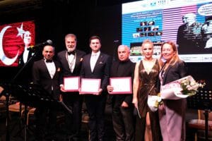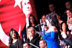 Gecenin sonunda sahneye davet edilen sanatçılar ve salondaki misafirler, büyük bir coşkuyla “İzmir Marşı” ile “Parla” şarkısını seslendirdi.