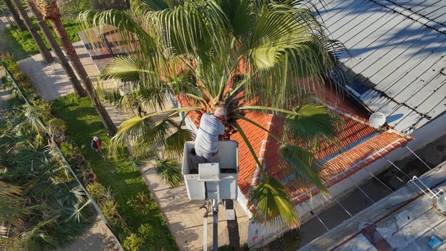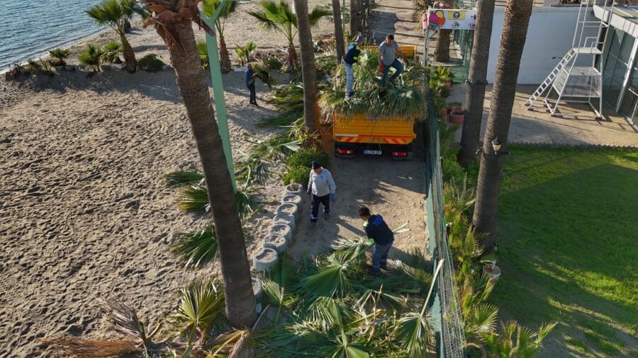Belediye ekipleri, uygun hava koşullarının oluşmasıyla birlikte palmiye ağaçlarında budama çalışmalarına başladı.