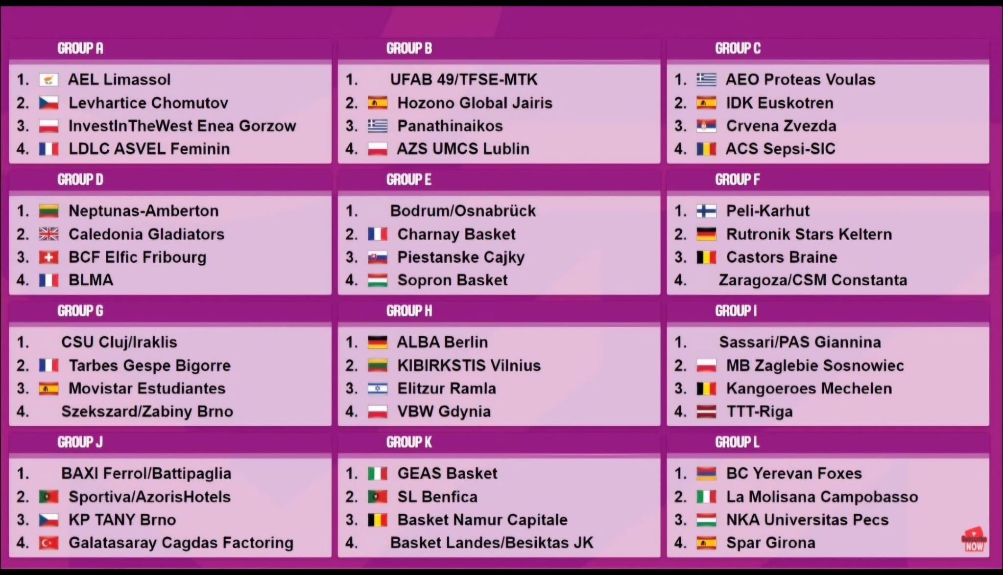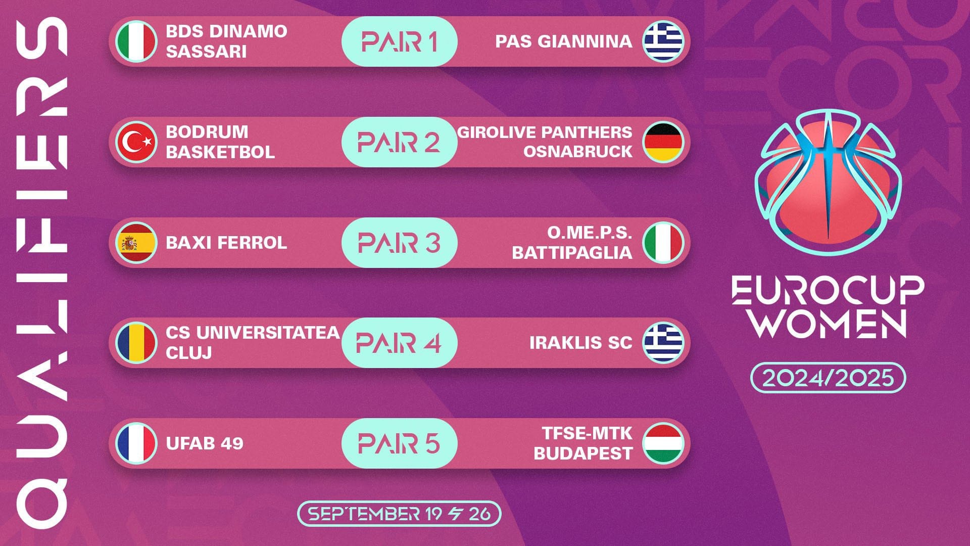 Alman takımı Osnabrück ile eşleşen Bodrum Basketbol, turu geçmesi halinde Euro Cup’ta E grubunda yer alacak. İki maç üzerinden oynanacak seride toplamda en çok sayıyı atan taraf adını gruplara yazıdıracak. Serinin ilk maçı 19 Eylül günü Almanya’da, ikinci maçı 26 Eylül’de Bodrum’da oynanacak.