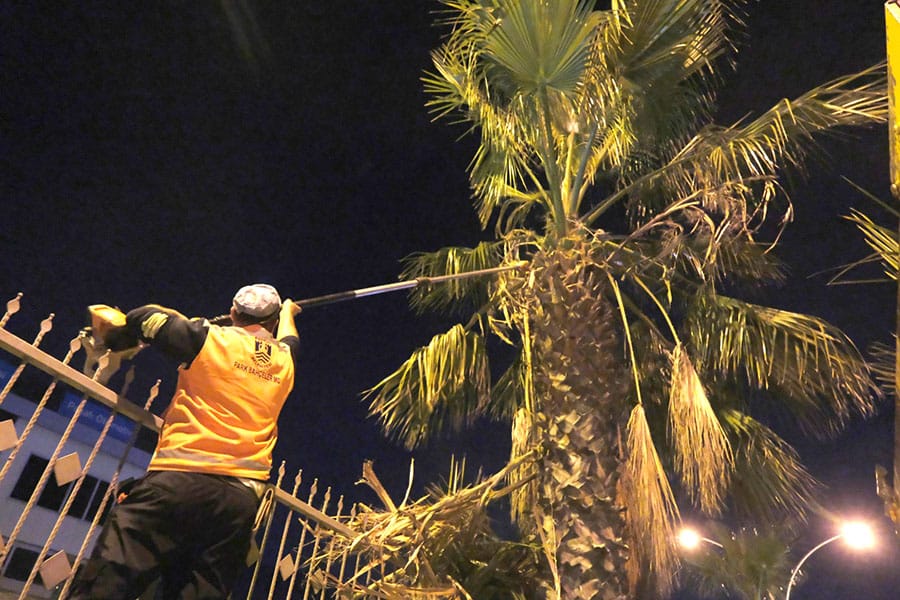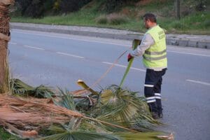 Park ve Bahçeler Müdürlüğünden 75 personel 10 ekip halinde yapılan ağaç budama çalışmasında, Destek Hizmetleri ve Temizlik İşleri Müdürlükleri de araç desteği sağlıyor. Çalışmada palmiye budaması dışında orta refüj ve ana yol boyunca ot biçme ve temizlik de yapıldı.