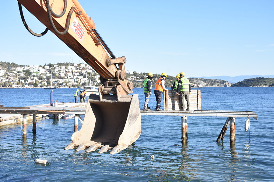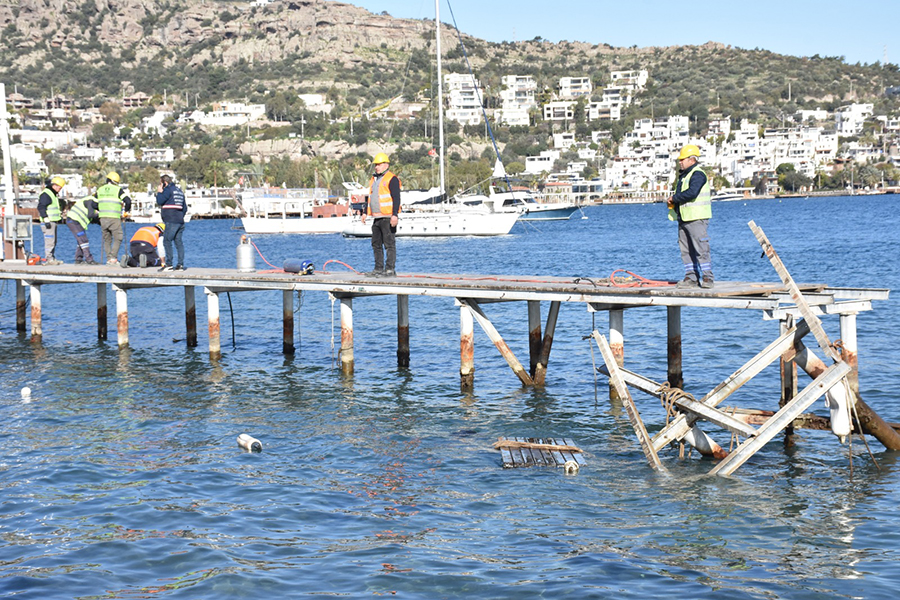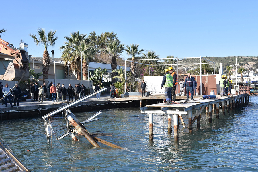 Bodrum’un Türkbükü Mahallesi’nde, balıkçı barınağının yan tarafında kaçak liman olarak kullanıldığı belirtilen iskele yıkıldı, 6 yüzer iskele de (ponton) dalgıç yardımıyla bağlantıları kesilerek açığa çekildi.